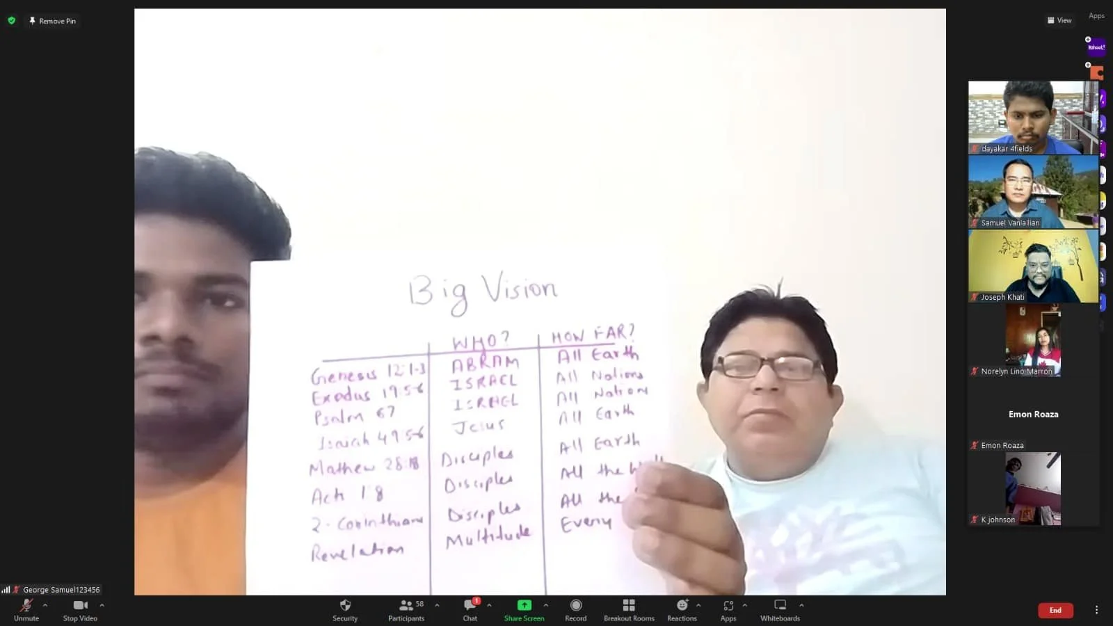 Dear respected brothers and sisters, Greetings to you all in the precious name of our Lord and Savior Jesus Christ. May grace of God, love and peace always be with you all. Today is the second week of our Asian group 4 field discipleship multiplication training through zoom. We had 57 participants from different parts of India, Bangladesh, Nepal, Philippines and others. Most of the key leaders did excellent job in Facilitating the program, lesson review, mutual time, cast vision, lesson of global vision, group discussion and practice, and setting goals for the week. It went well. Everybody was encouraged by the training. Many new brothers and sisters joined the training. We are all blessed to be a part of gospel share mission family. Breaking-up in groups was powerful and the short practice.